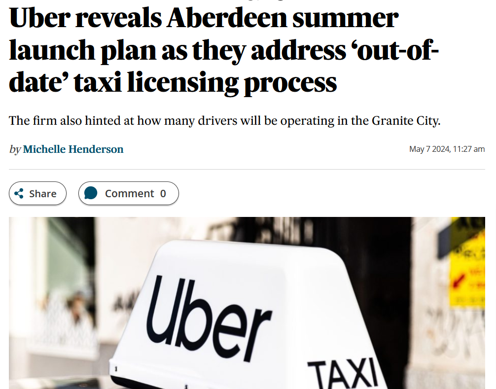 It looks like Uber has firmed up its promise (or threat…) to start operating in Aberdeen. According to the Press and Journal, Matthew Freckelton, Uber’s UK head of cities, told a local chamber of commerce podcast that the ‘US taxi app giant’ may be granted a licence in June, and could ‘go live as early as August’.
