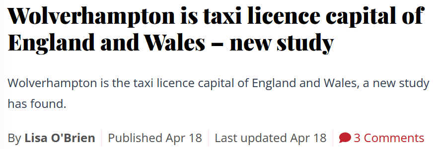 Leaving aside the pointlessness of the strapline, the headline itself is simply incorrect. As the article subsequently makes clear, Wolverhampton is only the ‘taxi’ capital if private hire vehicles (PHVs) are included in the numbers. Wolverhampton certainly issues a huge amount of PHV licences, but its actual taxi numbers are unremarkable. So the headline is only accurate if the word ‘taxi’ in the headline is used in the informal sense to mean either an actual taxi (sometimes called a hackney carriage) or PHV.